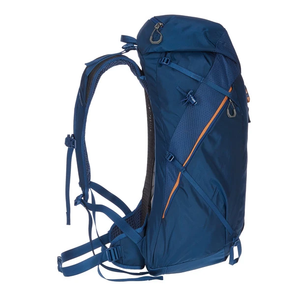 Der luftige Netzrücken des Arrio 30 ist nicht zu stark gekrümmt. Durch diese flachere Rückenform trägt er sich näher am Rücken und kann so auch sehr gut im Alltag genutzt werden. Das feuchtigkeitsleitende Meshpolster des Netzrückens geht direkt in die belüfteten Schultergurte über. Zwei leichte Hüftflossen sorgen für ein Extra an Komfort, fallen aber kaum auf, wenn du den Bauchgurt lieber abnimmst.