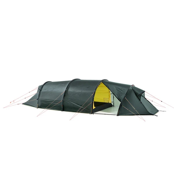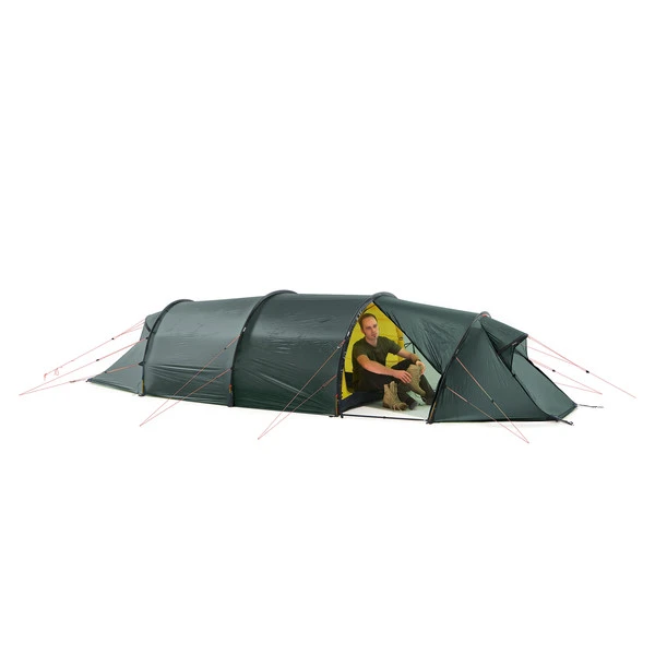 Großes Tunnelzelt mit zwei Apsiden. Geeignet für 2-3 Personen und Touren zu jeder Jahreszeit. Trotz der Größe ist es leicht genug, um auch bei Wanderungen im Rucksack transportiert zu werden.