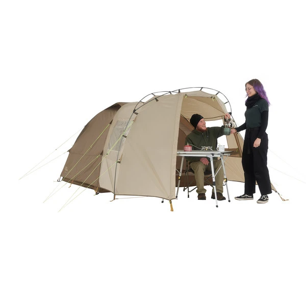Das Grand Illusion besteht aus zwei Teilen: einem Schlafraum und einem Vorzelt zum Zusammensitzen, Kochen, Spielen oder als Lagerraum fürs Gepäck. So können diese Bereiche klar getrennt und besser Ordnung gehalten werden. Zwei Eingänge garantieren, dass man sich nicht in die Quere kommt und das Zelt angenehm belüftet werden kann. Zwei große Fenster am Vorzelt sorgen für eine schöne helle Atmosphäre beim geselligen Beisammensitzen. So lassen sich auch lange Regentage gut aushalten.