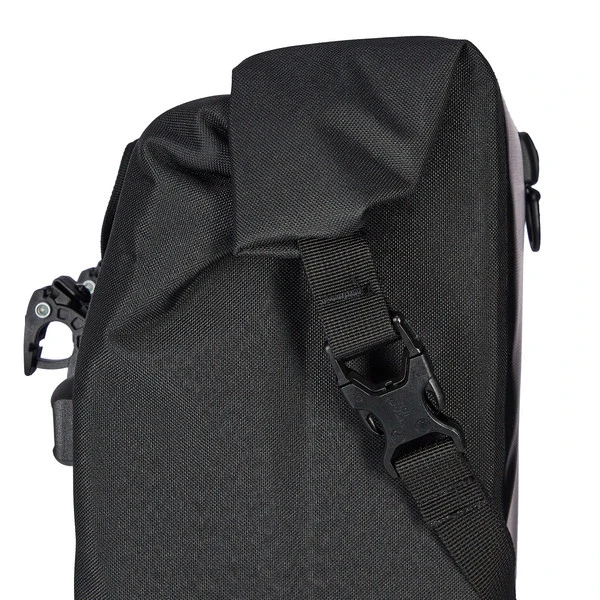 Aufhängung für Gepäckträger mit einem Rohrdurchmesser von 8 bis 16 mm. Die beiden oberen Haken lassen sich werkzeugfrei auf der aus einem Stück gefertigten Schiene verschieben und durch Anheben des Tragegriffs öffnen. Der untere Arretierungshaken auf einer halbelliptischen Schiene ist ebenfalls individuell anpassbar und werkzeugfrei in 15-Grad-Schritten drehbar. Ein Scheuerschutz im unteren Bereich der Taschen und an der Auflagefläche des Gepäckträgers beugt Abrieb vor.