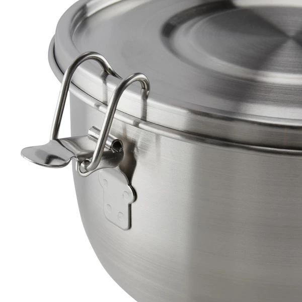 Schüssel aus 18/8 Edelstahl, ausgestattet mit einem Deckel, der mit drei Bügelverschlüssen sicher in Position gehalten wird. Der Deckel ist mit einer BPA-freien Gummidichtung ausgestattet.