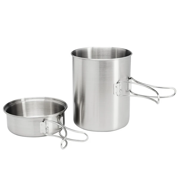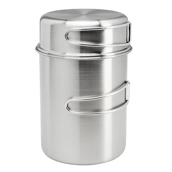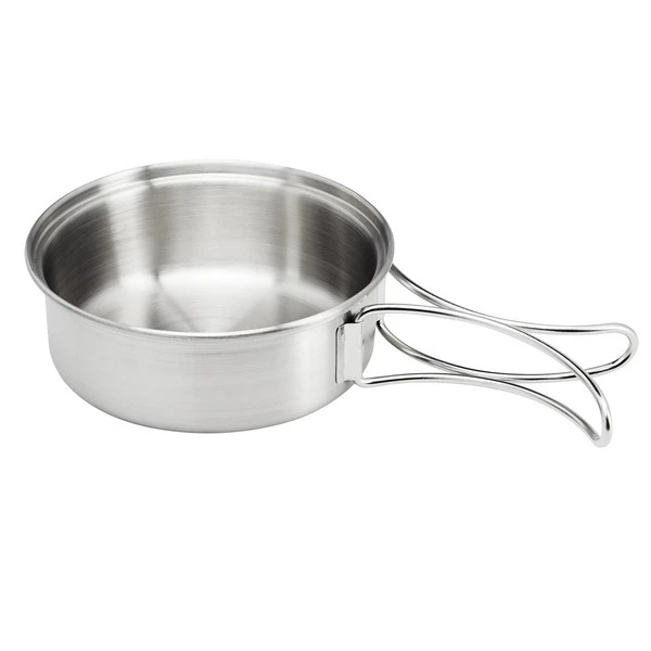 Robuste Ausführung aus Edelstahl. Der Topf mit 1,5 l Volumen besitzt einen Deckel (0,4 l), der auch als kleine Pfanne genutzt werden kann.